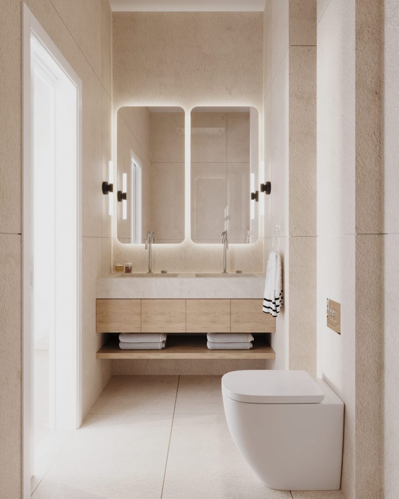 Cuenta con dos baños, con multitud de cerámicas para las paredes a elegir, equipados con inodoros de tanque oculto y platos de ducha con instalación in-floor, disponibles en varios colores a elegir. Ofrece la posibilidad de integrar la cocina en el salón o mantenerla como espacio independiente, y dispone de una espectacular terraza perimetral que rodea toda la vivienda, aportando una gran luminosidad a todas las estancias.