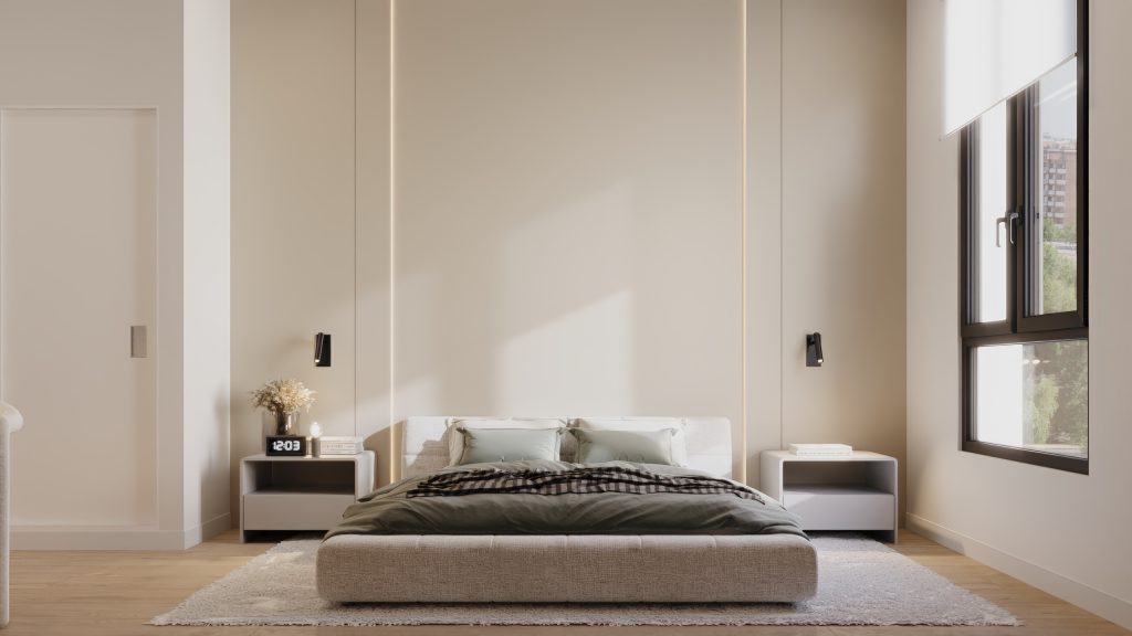 Vivienda de cuatro habitaciones con armarios empotrados vestidos interiormente y amplias ventanas.